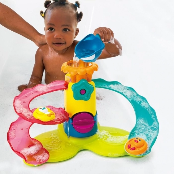 Zamień zwykłą kąpiel w przygodę z naszym kolorowym plastikowym aqua parkiem! Ta zabawka oferuje dwie spiralne zjeżdżalnie wodne połączone z centralną wieżą z niebieskim przyciskiem w kształcie kwiatu i ośmiornicą na górze, co wspiera spektakularną i wyobrażeniową zabawę. Dzieci będą cieszyć się godzinami zabawy w łazience z tą zabawką, która wspiera ruch i stymulację kolorami. Zawiera dwa zwierzątka na pontonach i nabierkę w kształcie wieloryba do nalewania wody.