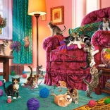 Puzzle przedstawiają przytulny salon pełen rozbrykanych kociąt i kolorowych kłębków wełny.