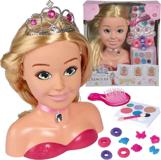 - Kompletny zestaw: głowa do czesania + korona, szczotka, spinki, gumki, paletka do makijażu