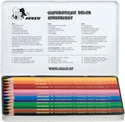 Zestaw 12 trójkątnych kredek DELTA w wytrzymałym metalowym pudełku. Ergonomiczny kształt dla wygodnego chwytu, miękki, nasycony rdzeń oraz odporność na łamanie – idealne dla dzieci od 3 lat.