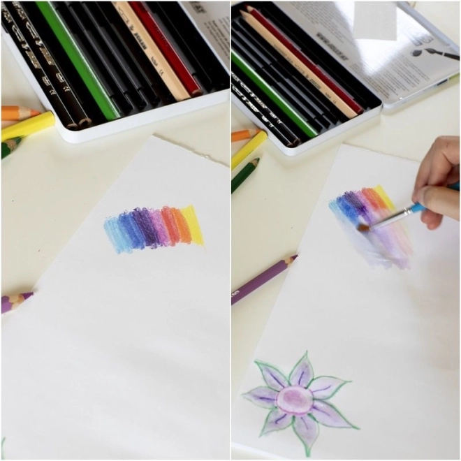 Kredki można łatwo rozmywać wodą – wystarczy kilka pociągnięć pędzlem, aby uzyskać subtelne akwarelowe przejścia i efekty.