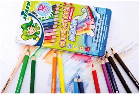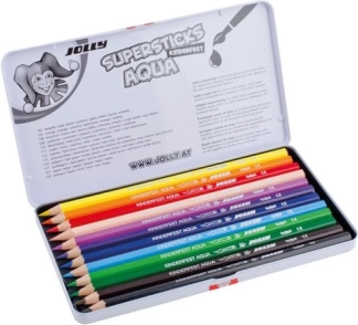 Odkryj kreatywne możliwości z akwarelowymi kredkami JOLLY Supersticks Aqua. Używaj ich na sucho dla intensywnego krycia lub dodaj wody, by zamienić kreski w delikatne akwarelowe malowanie. Metalowe pudełko chroni kredki w podróży i w domu oraz utrzymuje je w przejrzystym porządku.