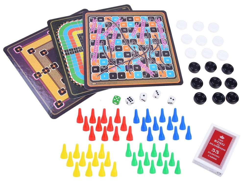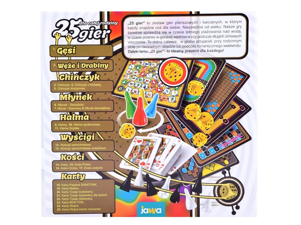 Zestaw gier planszowych, logicznych i karcianych dla każdego, do których w instrukcji podano 25 różnych propozycji rozgrywek.