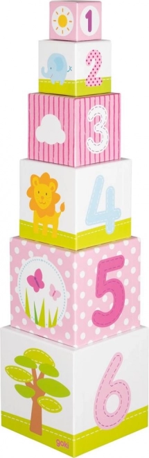 Największy klocek ma wymiary 14,3 × 14,3 × 14,3 cm, a po złożeniu powstaje stabilna wieża o wysokości do 57,5 cm. Wysoka jakość wykonania marki GOKI gwarantuje bezpieczeństwo, nieszkodliwość dla zdrowia i długą trwałość, idealną do codziennej zabawy.