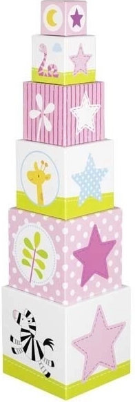 Zestaw zawiera 6 solidnych kartonowych klocków, które można ustawiać w wysoką wieżę lub wkładać jeden w drugi. Każdy klocek zdobią przyjazne ilustracje zwierząt, roślin i cyfr, dzięki czemu dzieci w zabawny sposób rozwijają podstawowe umiejętności i cierpliwość.