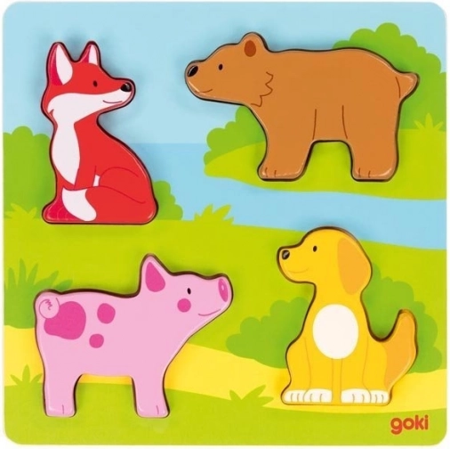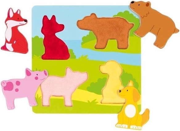 Ta wysokiej jakości drewniana układanka z czterema zwierzątkami (lis, pies, niedźwiedź, prosiaczek) skrywa pod frezowanymi otworami powierzchnie dotykowe, które naśladują ich sierść lub skórę. Dzieci podczas zabawy angażują wzrok i dotyk, lepiej łącząc kształty, kolory i wrażenia sensoryczne.