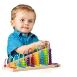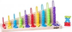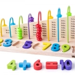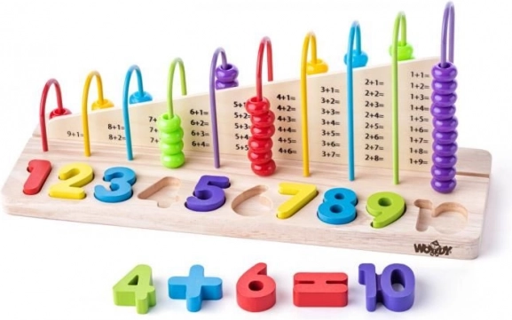 Zestaw zawiera drewniane liczydło oraz 13 wyjmowalnych kolorowych bloków w kształcie liczb i symboli +, - oraz =.