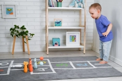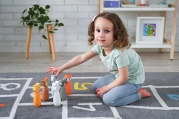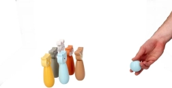Kręgle wysokie na 12,5 cm i kule o średnicy 5 cm są łatwe do trzymania i turlania – idealne na pierwsze „kręglarskie” próby.