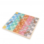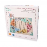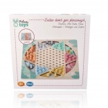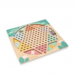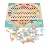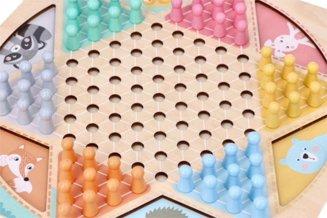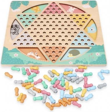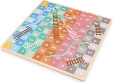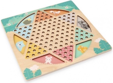 Dwustronna drewniana plansza o wymiarach około 30 × 30 cm zdobiona jest subtelnymi motywami zwierząt i uzupełniona kolorowymi, łatwymi do chwytania figurkami. Dzięki solidnemu wykonaniu i czytelnej grafice idealnie sprawdzi się do wspólnej zabawy dzieci i dorosłych.