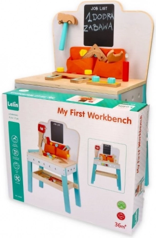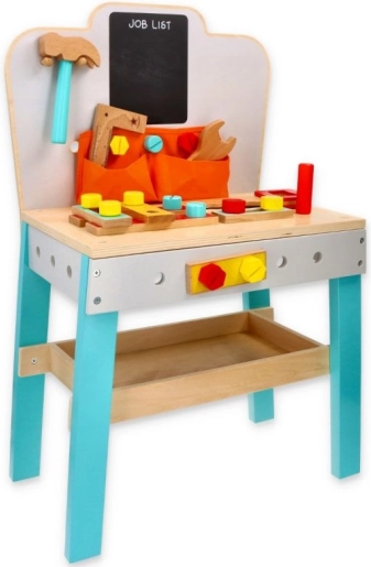 Drewniany dziecięcy stół warsztatowy z tablicą to idealny prezent dla małych majsterkowiczów. Stół zawiera odpowiednio dopasowane drewniane narzędzia, takie jak młotek, piłka i klucz, które pozwalają dzieciom symulować różne czynności konstruktorskie i naprawcze. Dzięki tablicy JOB LIST dzieci mogą planować swoje projekty i uczyć się organizacji pracy. Praktyczne kieszenie na narzędzia i półki zapewniają dużo miejsca do przechowywania.