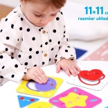 Każda plansza zawiera wycięcie i odpowiadający mu kolorystycznie element. System został zaprojektowany tak, aby możliwe było tylko jedno prawidłowe dopasowanie – dziecko w naturalny sposób zyskuje pewność i radość z sukcesu.