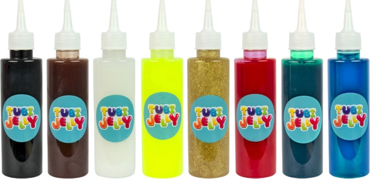 - 8 żelowych kolorów (150 ml) – niebieski, biały, czerwony, neonowy, brązowy, turkusowy, czarny i brokatowy