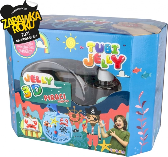 Zamień swój pomysł w wyjątkową morską przygodę 3D. Zestaw Tubi Jelly piraci pozwala łatwo malować kształty żelem na folii, utwardzić je w aktywatorze, a następnie umieścić w akwarium z wodnymi kryształami. Ciepła woda przyspieszy wzrost kryształów i Twoja piracka scena ożyje w mgnieniu oka.