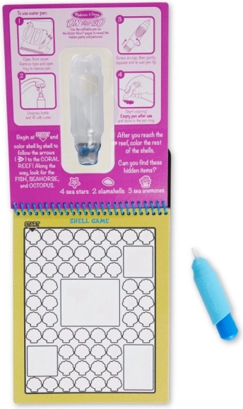 Interaktywna wodna kolorowanka z serii On the Go zapewnia dzieciom godziny twórczej zabawy. Napełnialny wodny pisak odsłania na stronach morski świat, zadania i labirynty, które po wyschnięciu znów znikają – i można zaczynać malowanie od nowa.