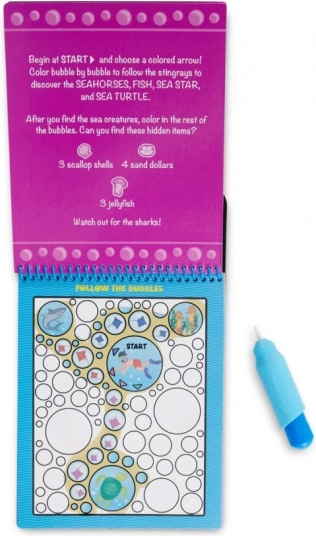 Napełnij dołączony wodny pisak i obserwuj, jak na stronach pojawiają się kolory, ukryte obrazki i ścieżki. Po wyschnięciu możesz malować od nowa.