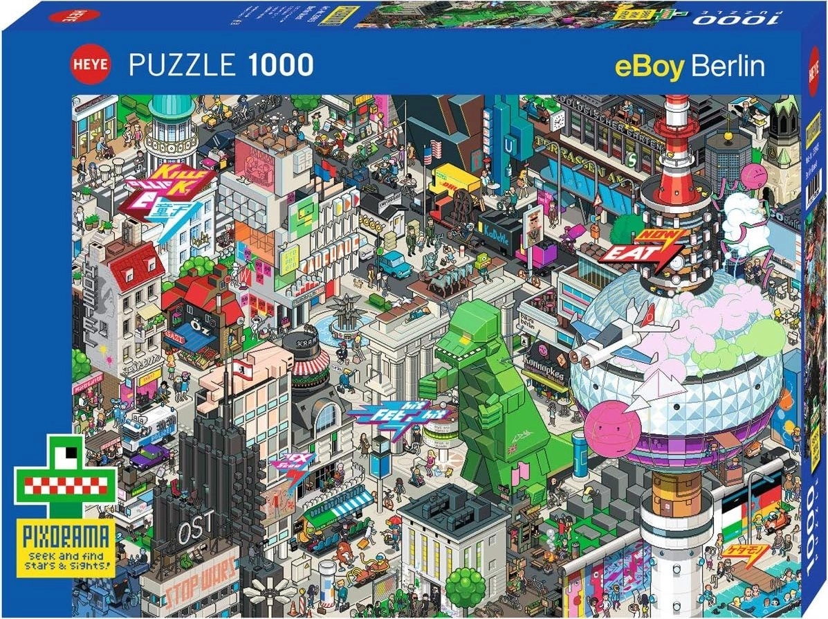 Odkryj wyjątkowe puzzle Pixorama z motywem Berlina od znanego kolektywu pixel-art Eboy. Czeka na Ciebie 1000 elementów pełnych detali, które razem tworzą kolorową, figlarną i precyzyjnie opracowaną scenę. Idealne dla miłośników miast, designu i bardziej wymagającego układania.