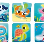 Ten zestaw zawiera 6 ilustrowanych kartoników z morskimi zwierzętami, z których każdy składa się z 4 dużych elementów. Dzięki nasyconym kolorom i prostym kształtom dzieci łatwo się orientują i szybko rozumieją zasadę układania. Wielkość elementów jest dostosowana do małych rączek i wspiera koordynację ręka–oko.