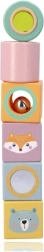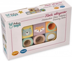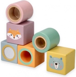 Klocki ozdobione są wesołymi ilustracjami zwierząt, takich jak lis i niedźwiedź, co dodaje nowy wymiar zabawie i kreatywności.