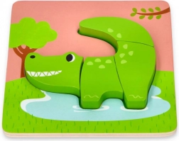 Odkryj zabawny zestaw czterech drewnianych puzzli ze zwierzętami – krokodyl, hipopotam, sowa i lew. Solidne elementy dla małych rączek, rozwój małej motoryki, koordynacji oko–ręka oraz rozpoznawania kształtów. Każde puzzle ma wymiary 16,5 × 16,5 cm i jest idealne na pierwsze układanki.