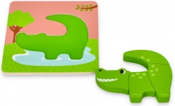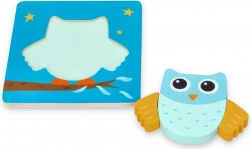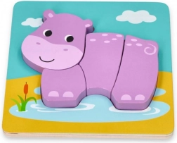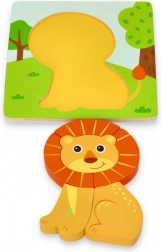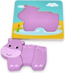 Dzieci kolejno ułożą krokodyla, hipopotama, sowę i lwa – każdy motyw na osobnej drewnianej planszy wspiera koncentrację i radość z sukcesu.