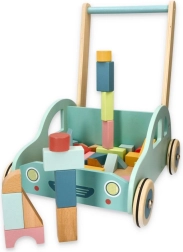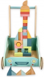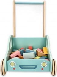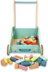Kolorowe drewniane klocki rozwijają małą motorykę, wyobraźnię i logiczne myślenie. Wózek służy jako praktyczna przestrzeń do przechowywania klocków i gotowych budowli.