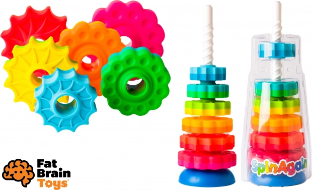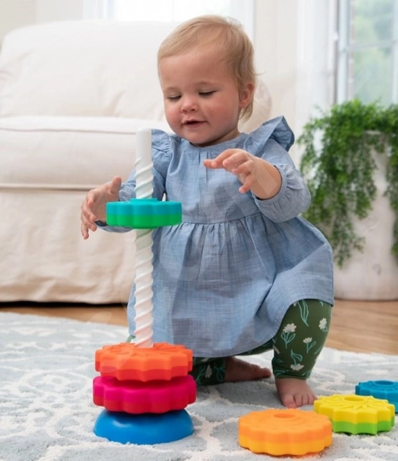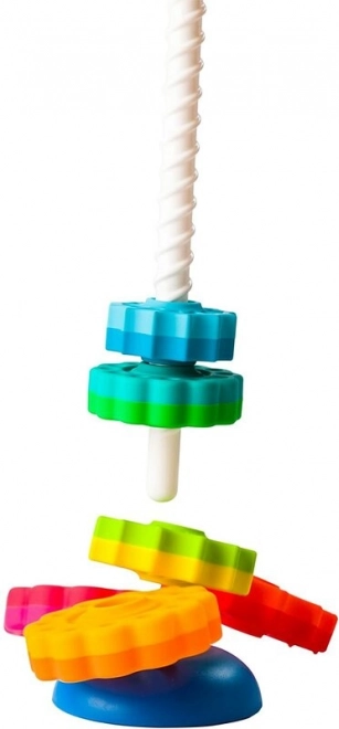 Zabawka, dzięki której dziecko ćwiczy motorykę. 6 różnych dysków obraca się w dół jak korkociąg i układa według własnej wyobraźni. Dyski naprzemiennie mają kształty kwiatów i gwiazd, a każdy jest w dwóch kolorach.