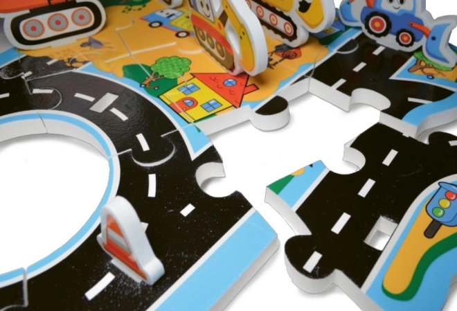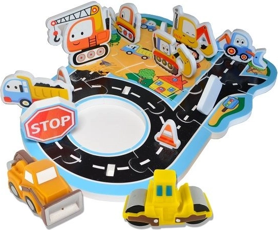 Lekkie piankowe elementy pływają i po zwilżeniu trzymają się kafelków. Dzieci ułożą drogi, rozmieścić znaki i ożywią zabawę pojazdami budowlanymi.