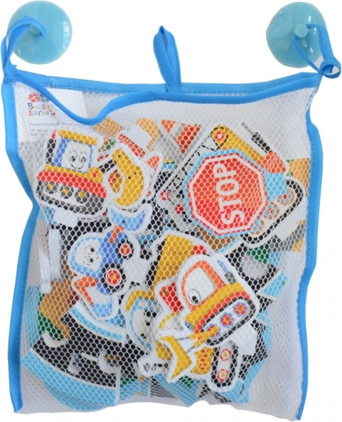 Dzięki wytrzymałemu materiałowi elementy są bezpieczne, miękkie i przyjemne w dotyku. Zestaw wspiera koordynację oko–ręka, myślenie logiczne oraz słownictwo. W komplecie może znaleźć się także praktyczny siatkowany woreczek z klipsami/przyssawkami do łatwego suszenia i przechowywania, aby łazienka zawsze była zadbana.