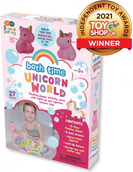 Zestaw kąpielowy Jednorożcowy świat wprowadza dzieci w barwny świat pełen jednorożców, zamków i magicznych ścieżek. Lekkie piankowe elementy pływają, składają się jak puzzle i po zwilżeniu trzymają się gładkich powierzchni łazienki. Dzieci mogą opowiadać własne historie i rozwijać fantazję prosto w wannie.