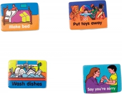 Cztery różne kartoniki przedstawiają prace domowe, takie jak ścielenie łóżka czy mycie naczyń, i pomagają dzieciom pamiętać o ich obowiązkach.