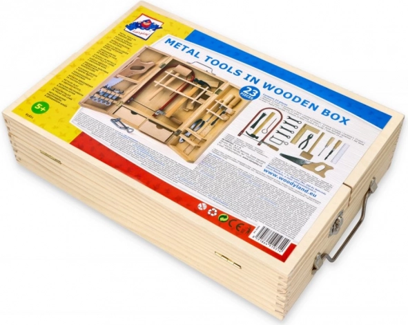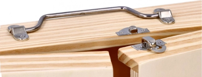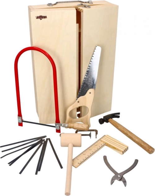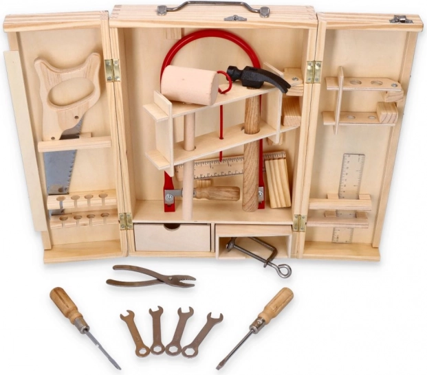 Drewniany stół roboczy dla dzieci z narzędziami i pudełkiem na narzędzia