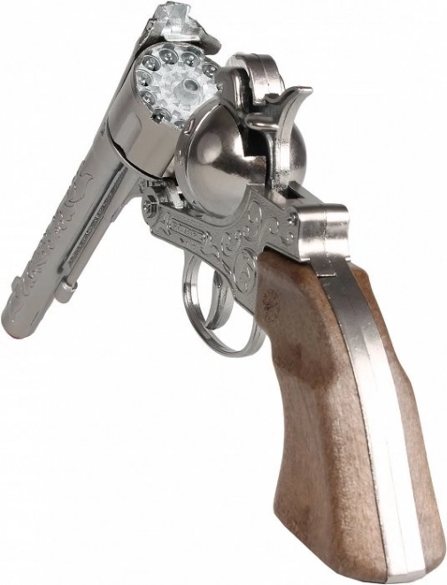Kowbojski metalowy rewolwer na 12 nabojów z bębenkiem.