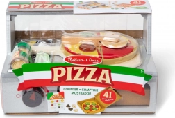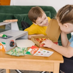 Zawiera drewnianą pizzę, różne dodatki i pieniądze do gry, co pozwala dzieciom doświadczyć całego procesu przygotowania i sprzedaży pizzy.