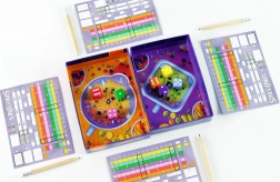 - 1 blok z arkuszami gry, 7 kości, 4 ołówki, instrukcja