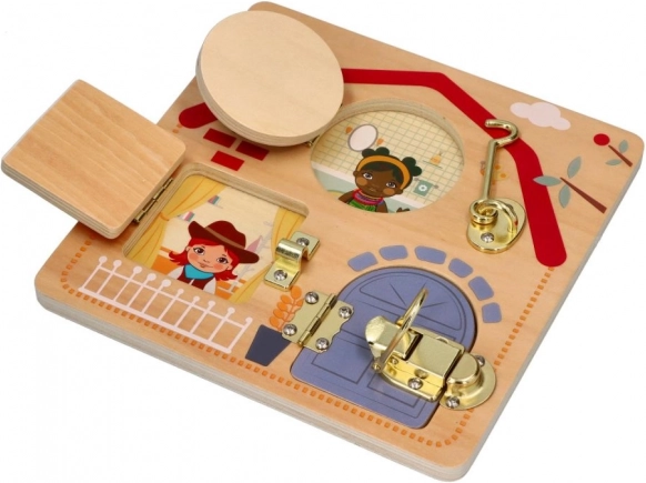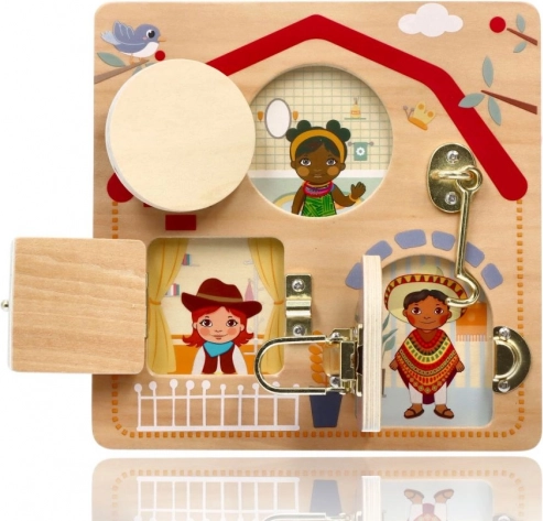 Ta sensoryczna tablica aktywności łączy zabawę z nauką. Otwierane drzwiczki, haczyki, zatrzaski i inne funkcjonalne elementy zachęcają dzieci do odkrywania, ćwiczenia palców i cierpliwości. Każde otwarcie odsłania kolorowe ilustracje postaci z różnych zakątków świata, które wspierają postrzeganie różnorodności i opowiadanie historii.