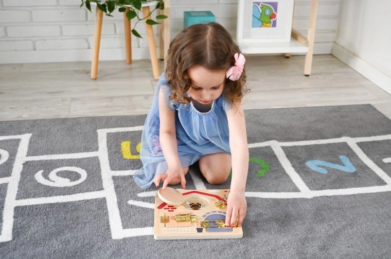 Tablica oferuje kilka typów zapięć, które dzieci stopniowo opanowują. Każdy mechanizm stawia nowe wyzwania i trenuje zręczność palców oraz cierpliwość.