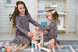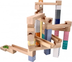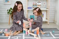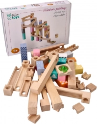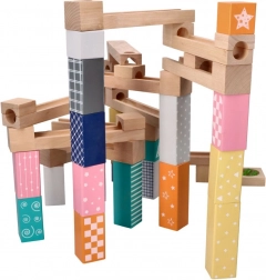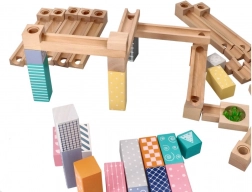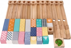 Ten wysokiej jakości drewniany tor kulkowy w delikatnych pastelowych barwach pozwala dzieciom budować oryginalne trasy i obserwować, jak kulki pędzą po rynnach, mostkach i przez otwory. Wytrzymałe drewniane klocki z nadrukowanymi wzorami zapewniają stabilność i atrakcyjny wygląd, rozwijając jednocześnie wyobraźnię przestrzenną.