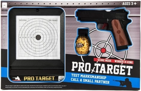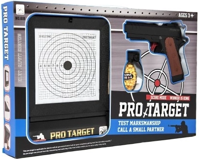Atrakcyjne opakowanie PRO-TARGET od razu pokazuje zawartość – pistolet, tarczę i miejsce na amunicję, idealne na prezent.
