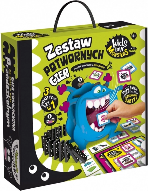 Zestaw pierwszych gier z potworami zawiera trzy tradycyjne gry dla najmłodszych, które wspierają rozwój myślenia logicznego. Opakowanie zawiera karty do klasycznej gry pamięciowej, gry loteryjnej oraz domino. I to nie wszystko! Z elementów można złożyć trójwymiarowego potwora, który pożera karty z gry pamięciowej.