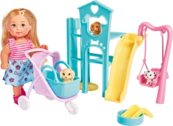 Evi opiekuje się 3 szczeniętami na placu zabaw z huśtawką, w zestawie wózek.