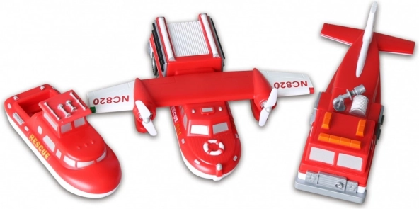 Złóż łódź RESCUE, amfibijny samolot oraz wóz strażacki – albo dowolnie je ze sobą łącz i twórz własne, oryginalne konstrukcje.