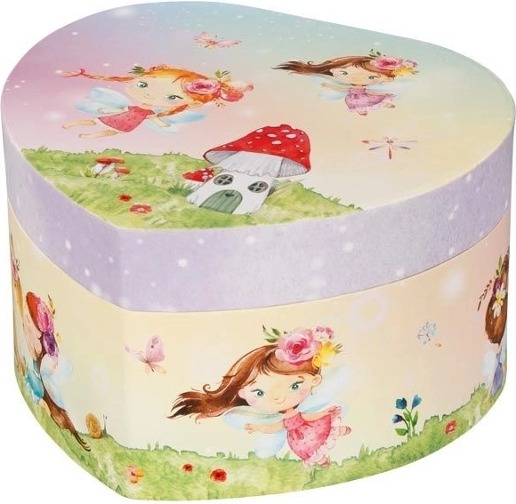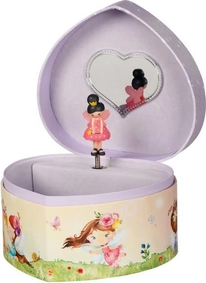 Ta urokliwa szkatułka w stylu pozytywki łączy bajkowy design z praktyczną przestrzenią do przechowywania. Po otwarciu wieczka uruchamia się znana melodia Jeziora łabędziego, a mała wróżka zaczyna się obracać przed lusterkiem w kształcie serca. Pudełko to doskonały prezent dla dzieci, które kochają biżuterię i baśniowe motywy.