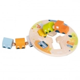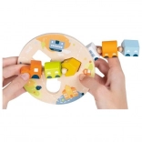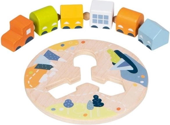 Wkładanie i przesuwanie pięciu różnie ukształtowanych wagoników pomaga dzieciom rozwijać chwyt, koordynację oko–ręka oraz cierpliwość.