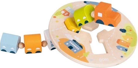 Ten wysokiej jakości drewniany pociąg marki GOKI został zaprojektowany jako pomysłowa zabawka rozwojowa wspierająca umiejętności dziecka. Lokomotywa z pięcioma różnie ukształtowanymi wagonikami przejeżdża przez przewlekaną bazę i jedzie dalej tylko wtedy, gdy wagoniki są umieszczone na właściwym miejscu. Dzieci w naturalny sposób uczą się logiki oraz koordynacji oko–ręka.