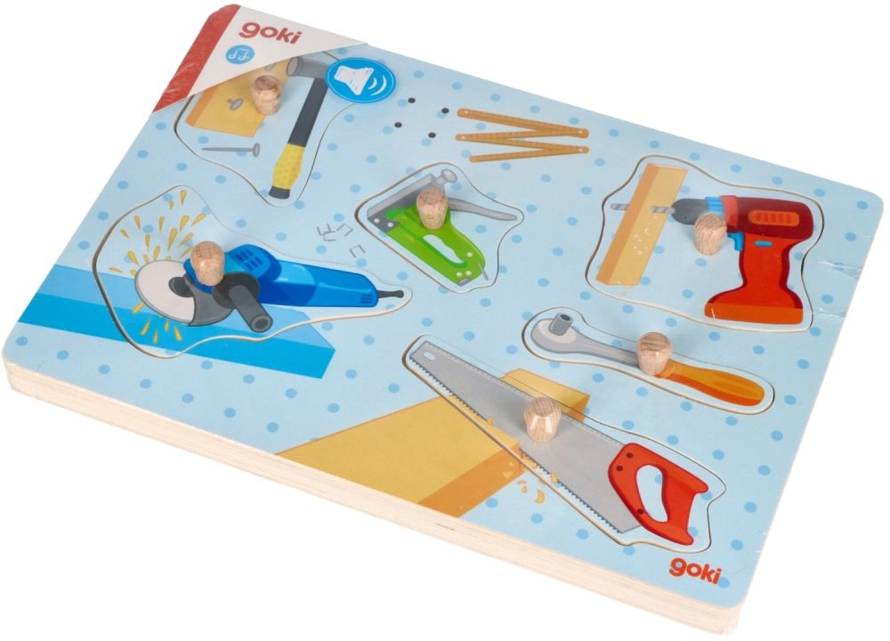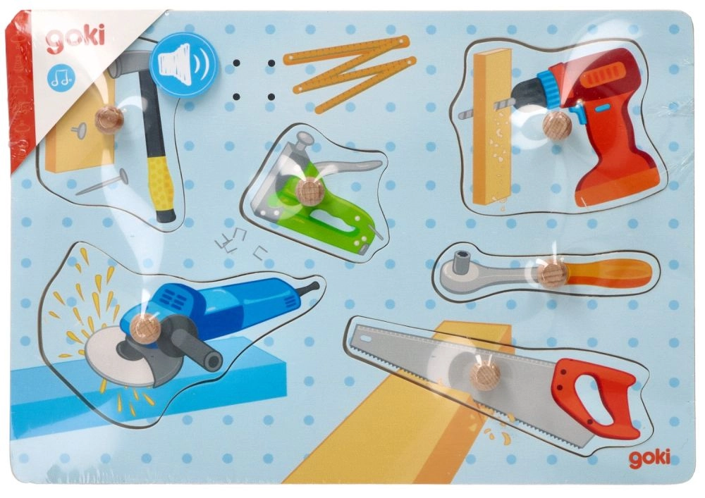 Kolejną ciekawą propozycją jest dźwiękowa układanka z narzędziami firmy Goki. Podczas zabawy dziecko dopasowuje elementy do pustych miejsc. Układanka wykonana jest z naturalnego drewna, składa się z solidnej podstawy i 6 elementów z uchwytami. Znajdziesz tu najpopularniejsze narzędzia, takie jak śrubokręt, młotek, szlifierka, piła, wkrętarka akumulatorowa i klucz. Po położeniu elementu na podstawie dziecko usłyszy dźwięk. Zabawka wymaga 2 baterii AAA – baterie nie są dołączone do zestawu. Wymiary: 30 x 21 cm Wiek: 1+ Odnośnik: 57368 Deklaracja zgodności CE
