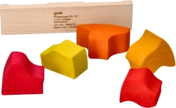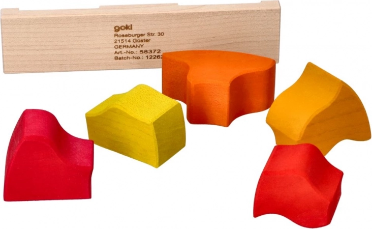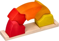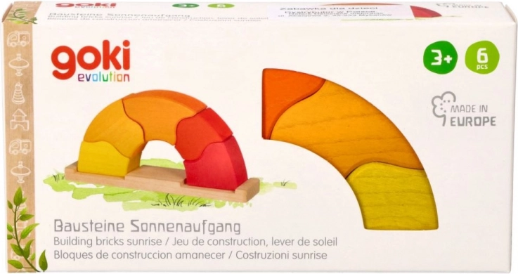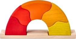 Drewniana układanka Wschód słońca marki GOKI daje dzieciom i rodzicom radość odkrywania. Kolorowe łuki w odcieniach żółci, pomarańczu i czerwieni układa się na drewnianej podstawie, co zachęca do eksperymentowania, budowania i swobodnej twórczej zabawy. Zabawka naturalnie rozwija koordynację ręka–oko, cierpliwość oraz podstawowe zasady równowagi.