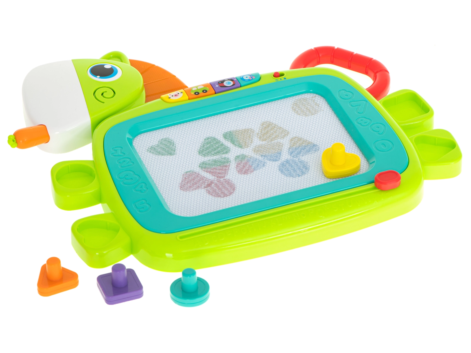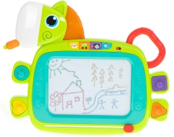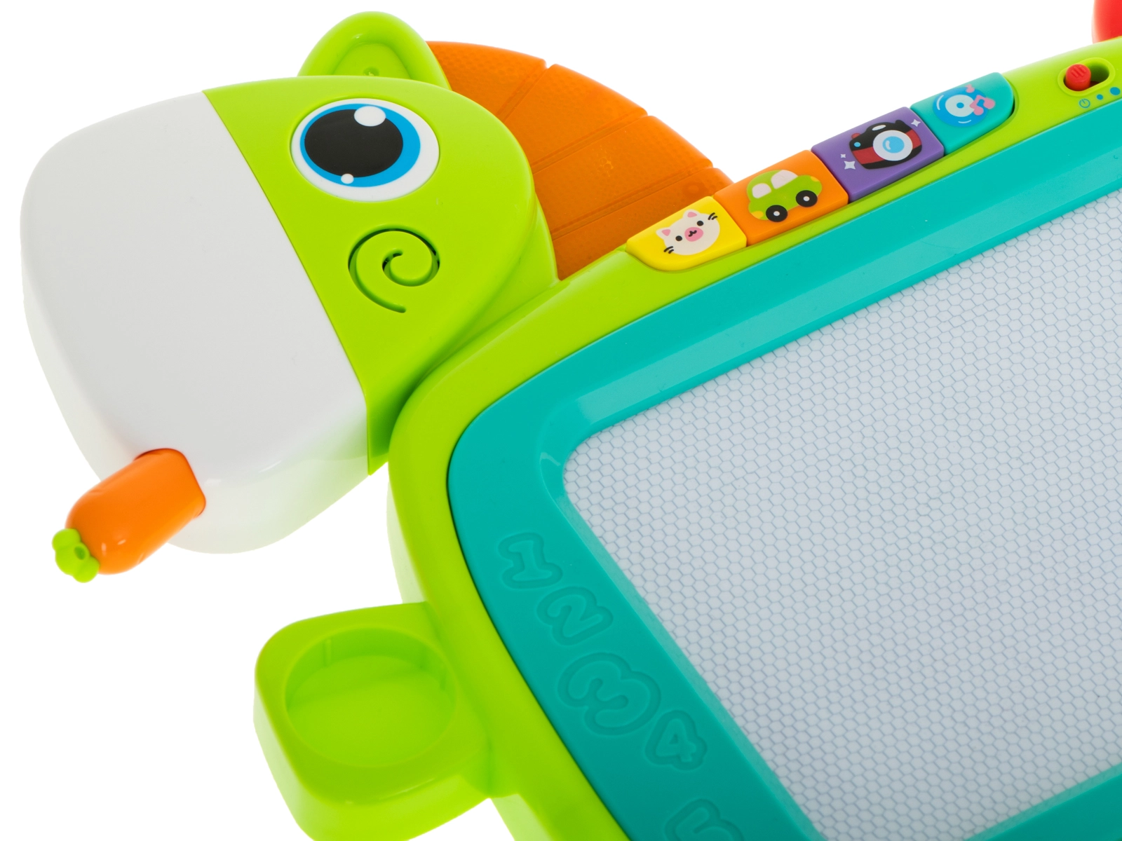 Interaktywne elementy oferują dźwięki zwierząt, dźwięki pojazdów, dźwięki domowe oraz wesołe melodie. Zabawka ma 2 poziomy głośności oraz możliwość całkowitego wyciszenia. Rysik w kształcie marchewki podczas wsuwania do „pyszczka” konika wydaje efekt chrupania. Krawędzie tablicy zdobią wypukłe litery i cyfry – idealne do pierwszego poznawania kształtów.