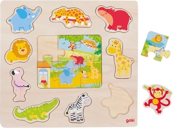 Drewniana układanka dla małych dzieci z motywem zwierząt z zoo oferuje 9 elementów do układania oraz puzzle z 6 częściami. Idealna do rozwoju koordynacji i myślenia dziecka.