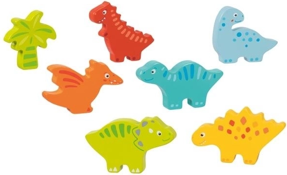 Ta układanka jest idealna dla małych dzieci, które chcą odkrywać świat dinozaurów. Elementy są umieszczone na drewnianej podstawie, co ułatwia układanie, a specjalne ramki sprawiają, że poszczególne drewniane elementy pozostają na swoich miejscach.