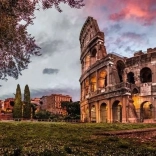 Ciesz się naprawdę pięknym panoramicznym widokiem na Koloseum o zachodzie słońca z wszystkimi szczegółami, które nadają obrazowi zapierającą dech w piersiach realistyczność.